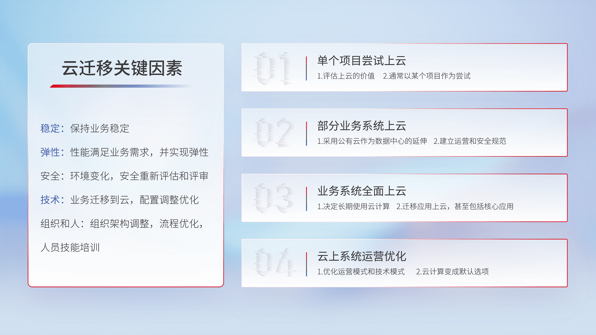 结合实际业务,,从规划设计、、云平台选型、、、、云原生改造、、、、数据迁移、、、、集成交付,,迁移全过程为客户识别最佳上云路径,,,,做好风险识别管理,,设计网络架构、、、身份权限、、、、安全审计合规、、、、操作审计、、、、日志审计、、、监控告警策略、、多站点容灾设计等,,,,对云上基础设施进行整体规划,,,提升IT治理水平,,以满足弹性、、高可用、、、高性能的需求。。。