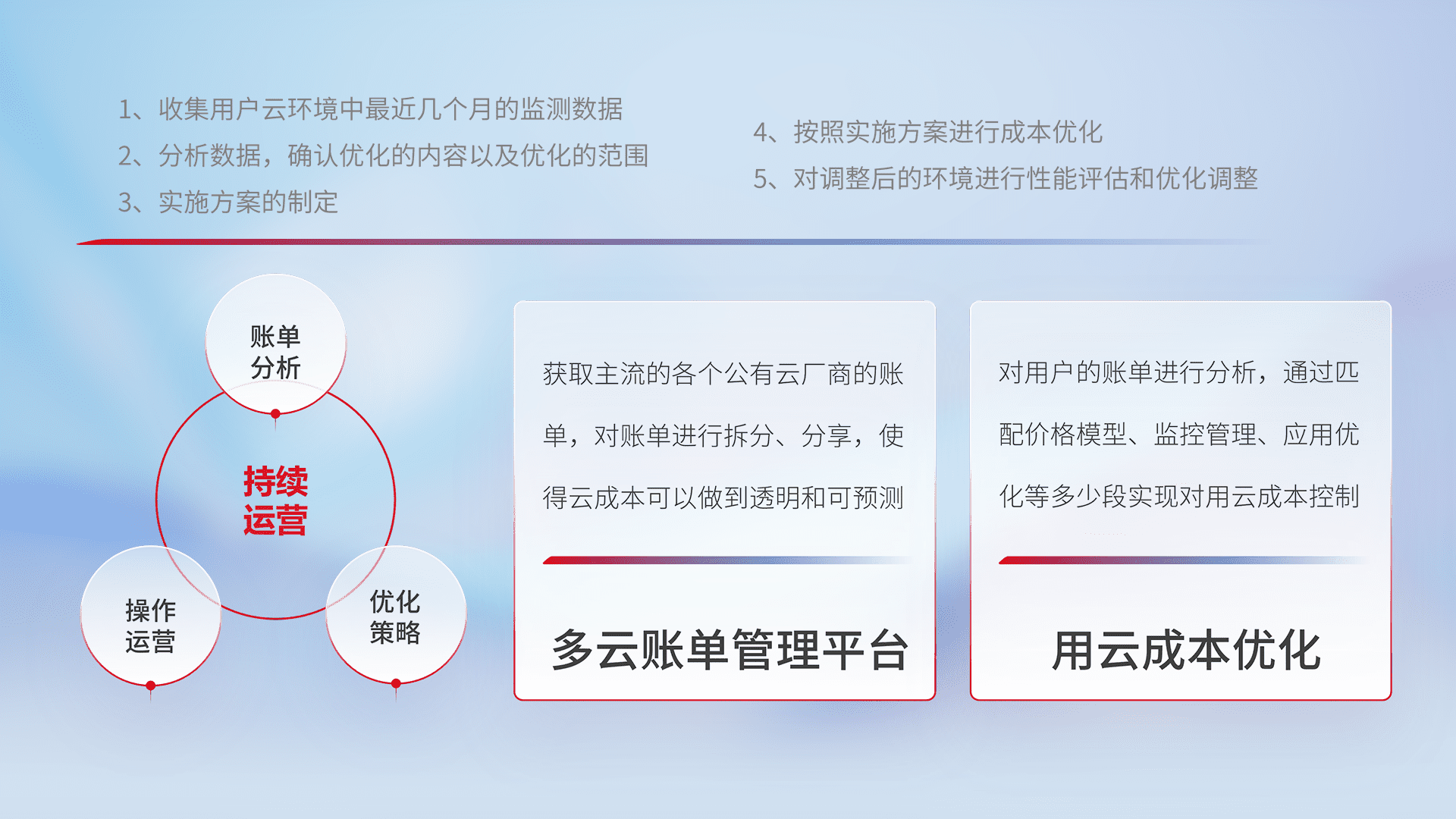 通过多云纳管,,,以统一的资源数据模型把客户的云资源进行抽象和封装,,进而实现对多云资源的统一操作,,,,保障云资源管理的可靠性、、、、稳定性与可用性。。量身定制化运维内容,,,,配置、、开发运维、、、、补丁管理、、、备份、、、、监控、、、认证和访问管理、、、审计和日常巡检等,,保障在用云过程中的可靠度,,稳定度以及高可用率。。。